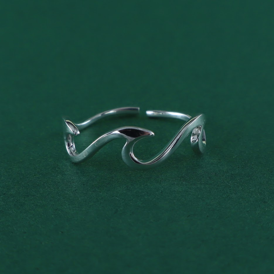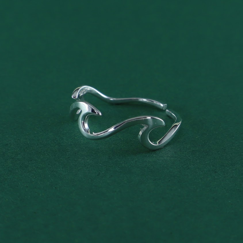Anillo ajustable en plata de ley 925 con diseño de olas del mar en relieve continuo, flexible para ajustarse a diferentes dedos. Su forma ondulada y minimalista evoca el movimiento del océano, perfecto para un look veraniego o boho casual.