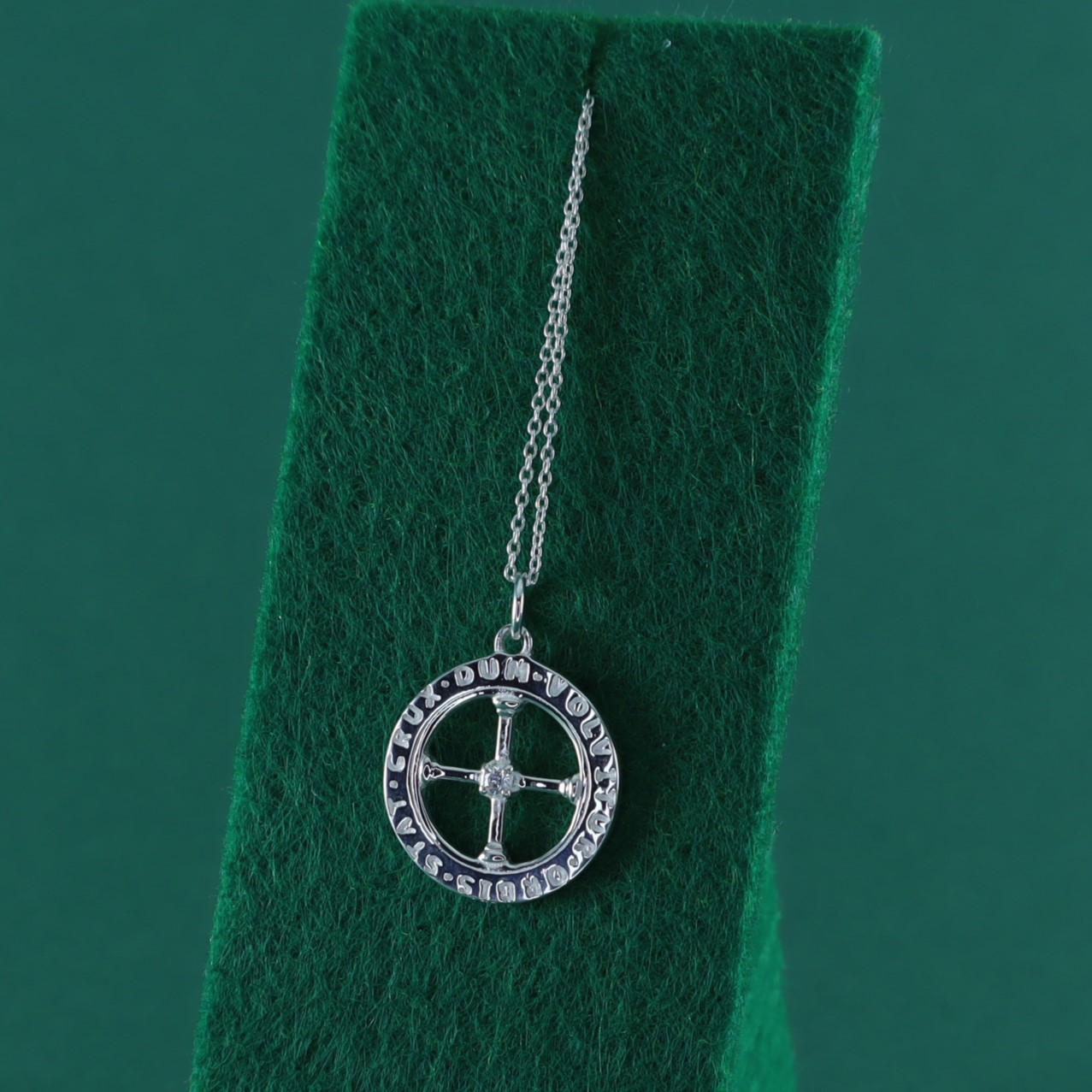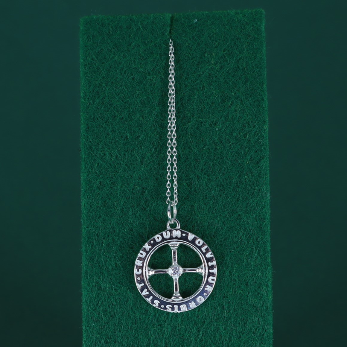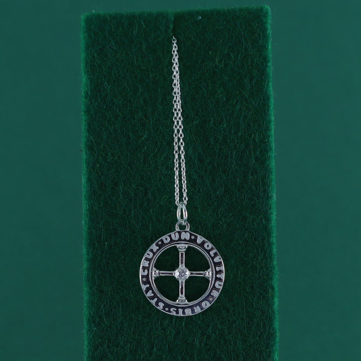 Colgante en plata 925 con cruz central con circonita, rodeada por la inscripción latina “Stat Crux Dum Volvitur Orbis”. Un lema que significa “La cruz permanece firme mientras el mundo gira”. Cadena no incluida. Encuentra la combinación perfecta en nuestras cadenas de plata en el menú «Collares plata».