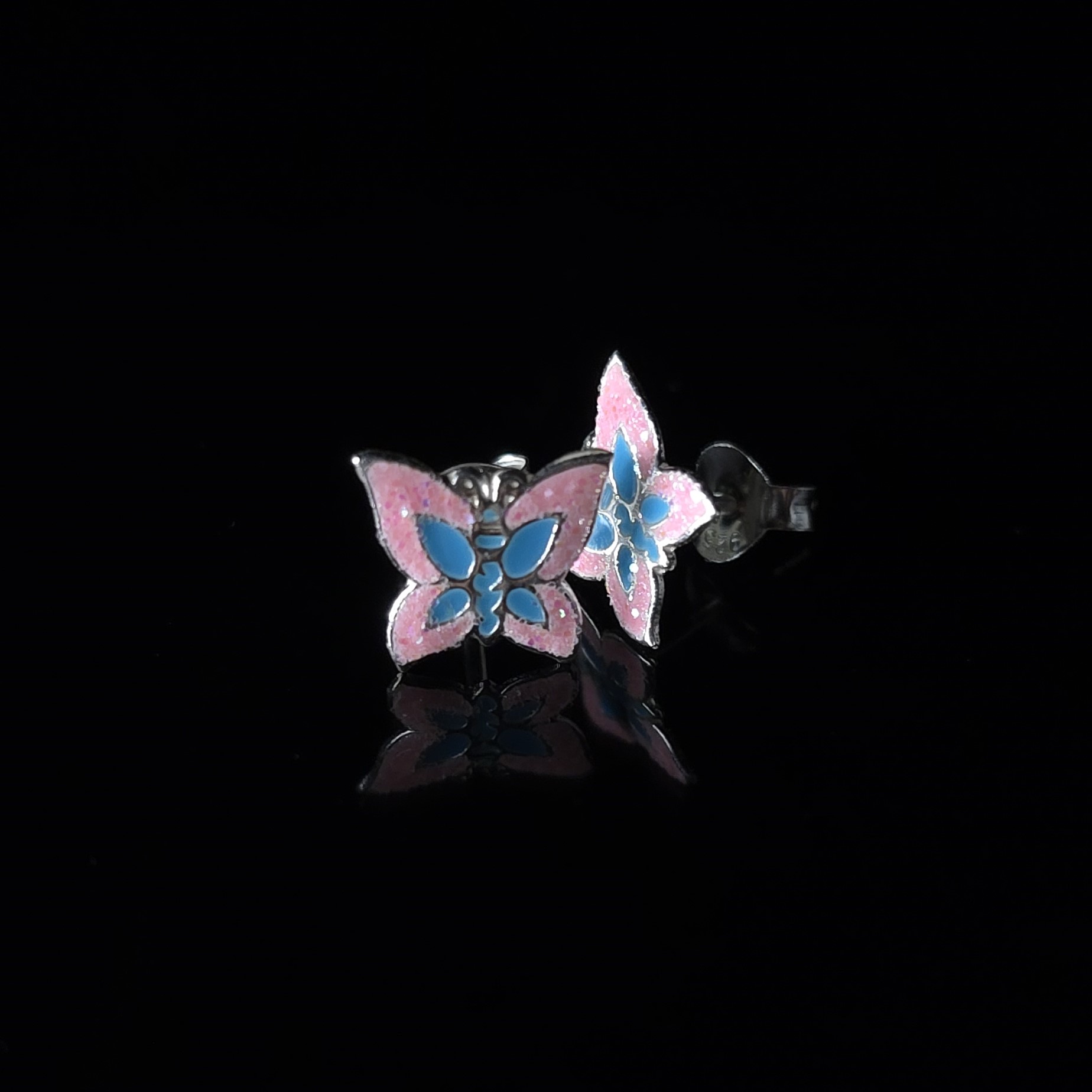 Pendientes de plata 925 con mariposa esmaltada en rosa y azul con efecto glitter, llenos de brillo y color para dar protagonismo a las orejas más pequeñas. La mariposa simboliza transformación, libertad y renacimiento, por lo que estas piezas no solo son alegres y divertidas, sino también un pequeño amuleto que recuerda los nuevos comienzos…