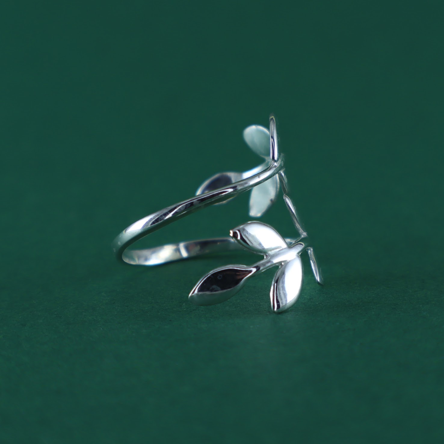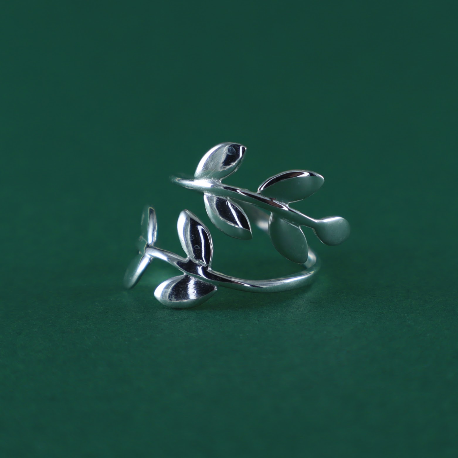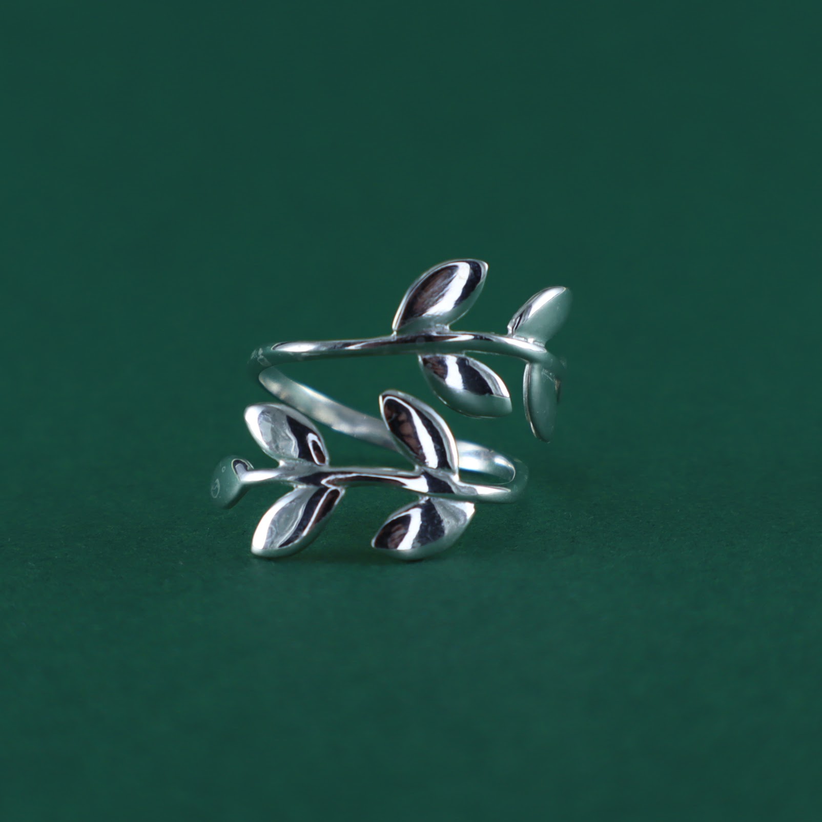 Anillo abierto en espiral de plata de ley 925 con hojas detalladas que se envuelven alrededor del dedo. Su diseño natural y orgánico, inspirado en ramas y follaje, crea un efecto boho elegante y ajustable para cualquier talla.